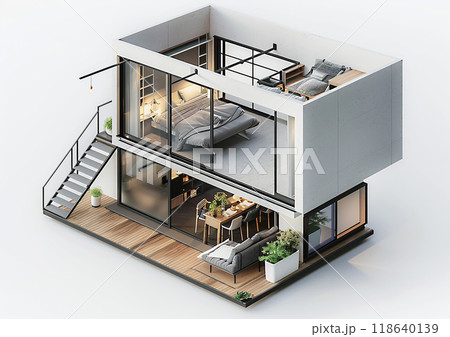 Tiny house mockup, loft style, 3D isometric view, white background, modern and sleek design