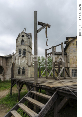 Horror background image of fantasy witch house standing on evening mountain woods land with gallows, crow and mist.