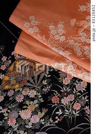 和服和帶,和服,黑色 tomesode 和帶花卉圖案的帶,背景材料
