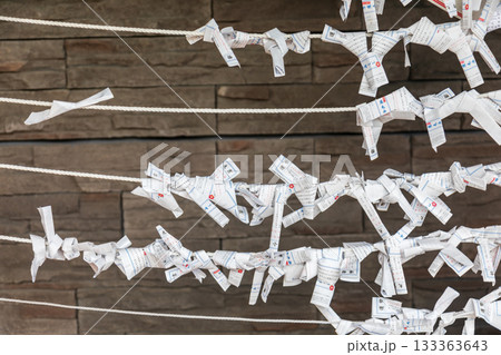 特寫捕捉繫在繩索上乘載願望的傳統白色紙籤