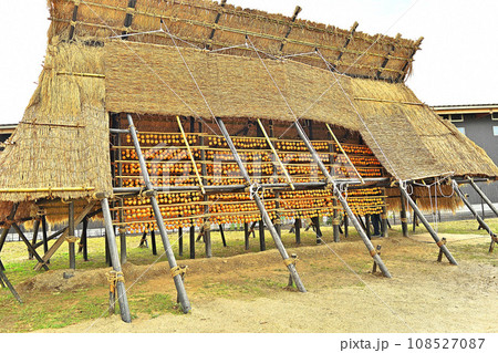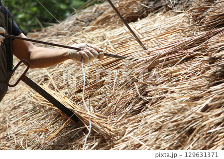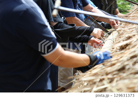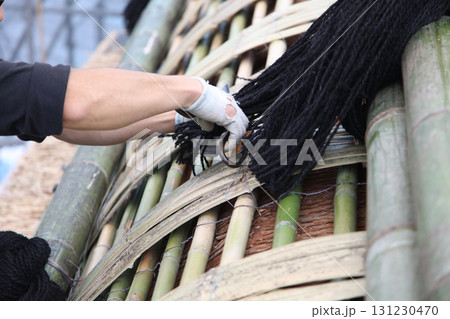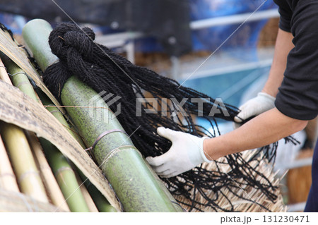 在用繩索組裝原木製成的茅草屋頂的建築物內