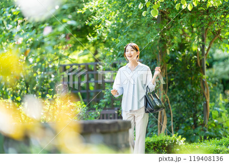 One successful young chinese business woman using mobile device tablet iPad in front of greenery