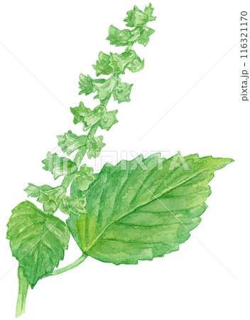兩片重疊的綠紫蘇(大葉)水彩插圖