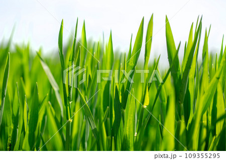 Green sprouted grass in the rays of the setting sun . Oat grains on the table. The concept of ecology, green energy, healthy nutrition and lifestyle.