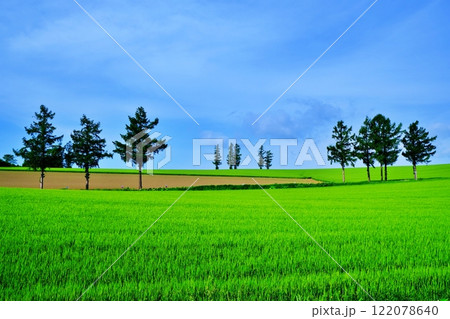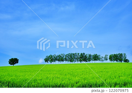 美瑛真榮之丘 夏天的藍天和廣闊的麥田和草地