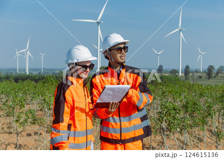 Engineer workers teamwork working together service maintenance wind turbine clean power green energy