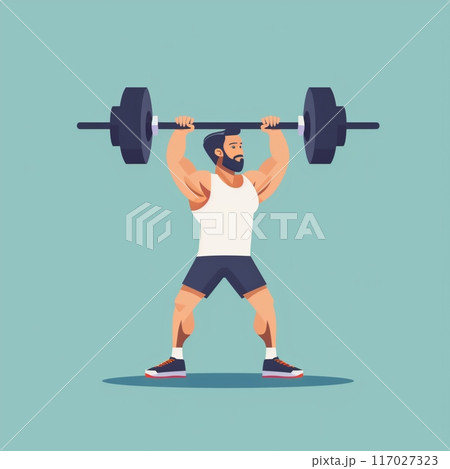 Illustration of a man lifting a heavy barbell above his head. The background is a solid teal color, highlighting the weightlifting action.