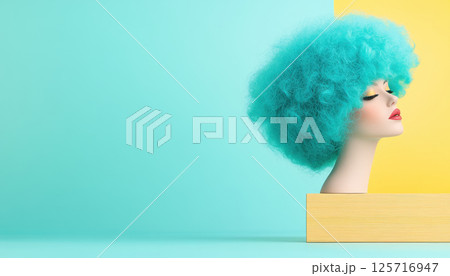 vibrant mannequin head with bold teal curly wig against bright yellow and turquoise background, showcasing playful and artistic style