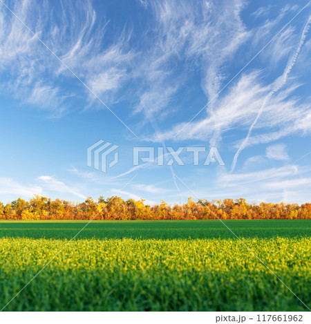 An autumn landscape featuring a lush green field, golden-hued trees and a majestic sky
