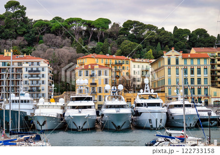 Red and orange buildings in Nice, France, boats and yachts at the Lympia port
