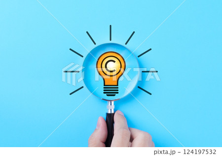 Intellectual Property and Copyright Protection Concept. Magnifying glass on lightbulb icon with copyright symbol, idea, innovation, intellectual property, and patent protection in creative industries.
