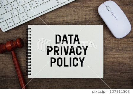 Data Privacy Policy text written with gavel, keyboard and optical mouse on wooden background