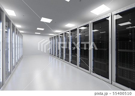 Modern data center server room with rows of illuminated black cabinets and cooling systems for high capacity data storage and processing efficiency