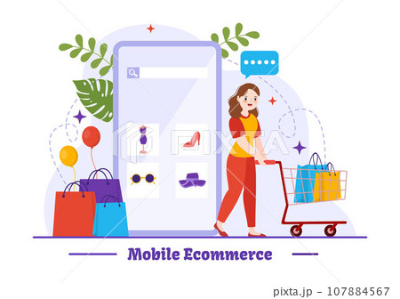 Mobile E-Commerce Vector Illustration of Smart Phone for Activities of Online Shopping and Digital Marketing Promotion with Bag and Gift Box Design