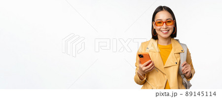 Stylish young asian woman tourist, traveller with backpack and smartphone smiling at camera, posing against white background