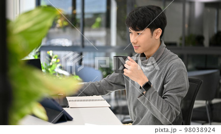 Focused young Asian male graphic designer or website developer sipping coffee while working