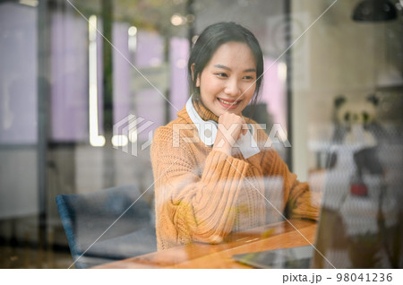 An Asian woman in white sweater using her smartphone while relaxing in the cafe. close-up image