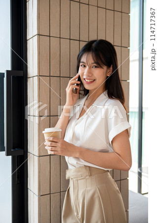 An attractive Asian woman holding her coffee cup while talking on the phone in the building.