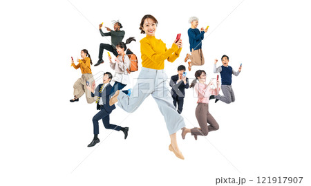 各代人在使用智慧型手機時跳躍 - 手工精確裁剪的透明背景全身照片 PNG