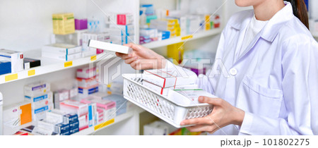 Pharmacist chemist woman standing refills the shelves with new stocks in pharmacy drugstore