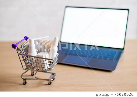 Laptop with blank white screen and miniature shopping cart full of medicines. Online pharmacy concept. Website for buying tablets.