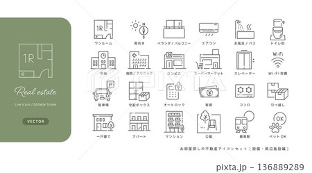 用於尋找房間的房地產圖示集(包含週邊設施和設備)向量圖,線條繪製,單色