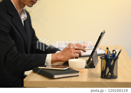 Cropped shot businessman in formalwear managing tasks on digital tablet