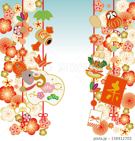 2027年新年賀卡:羊(羊年)圖案泥鈴 - 新年賀卡素材,新年,松竹梅花裝飾,圖標,設計素材