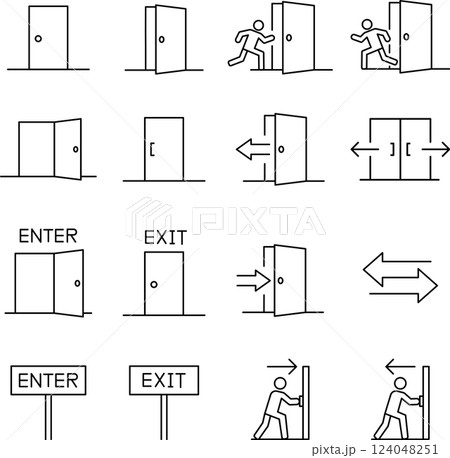 Entrance icons. Open door, Building entry, Emergency exit. Closed doorway, Doorframe, House entrance outicons. Door knob, home entry, building access. Interior gate, double door. Vector