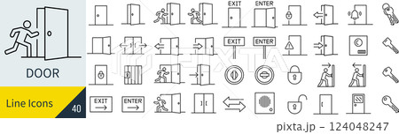 Entrance line icons. Open door, Building entry, Emergency exit. Closed doorway, Doorframe, House entrance outline icons. Door knob, home entry, building access. Interior gate, double door. Vector