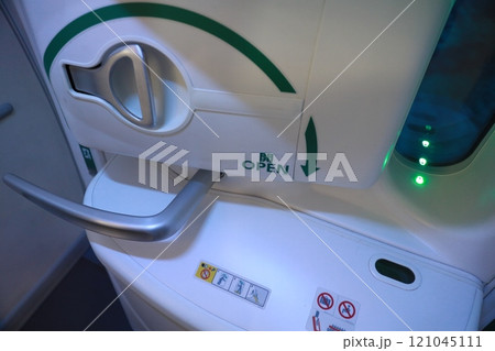 A secure emergency exit door with a wheel-lock mechanism is mounted on a ship or industrial wall. A red fire extinguisher is attached beside the hatch labeled.