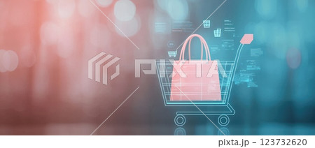 Futuristic digital interface showcasing retail icons like shopping carts, logistics, and business elements.