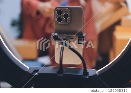 Start up small business owner. Female asian live streaming online for sale a clothes, e-commerce and marketing media