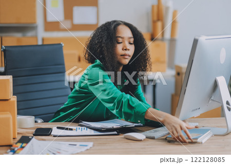 Young business woman asian working online ecommerce shopping at her shop. Young woman sell prepare parcel box of product for deliver to customer. Online selling