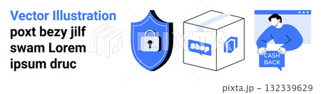 Cybersecurity shield with a lock, shopping box with Shop text, and person showing Cash Back sign in a browser window. Ideal for e-commerce, online shopping, cybersecurity, promotions, digital