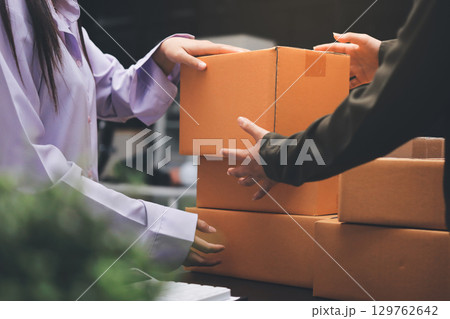 Portrait of Starting small businesses SME owners, two Asian woman check online orders Selling products working with boxs freelance work at home office, sme business online small medium enterprise