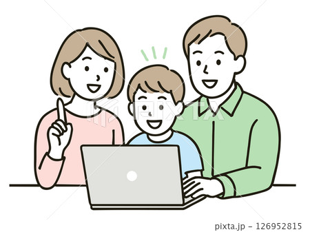 Asian mom and child learning Chinese language together online using computer in a bright home