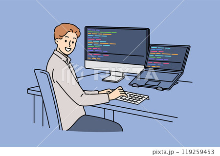 Man programmer types code and looks at camera, sitting at table with computer and laptop