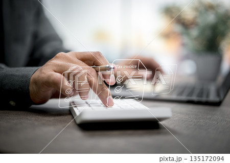 Person Typing on Calculator with Tax Invoice Icons Business Finance Concept