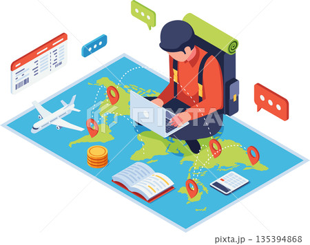 Isometric Traveler Planning Trip with Laptop on World Map