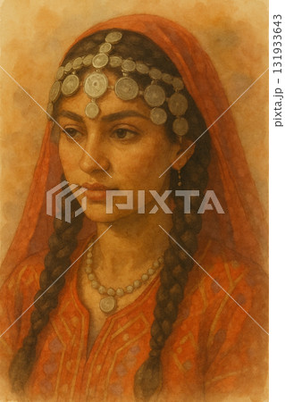 佩戴銀幣頭飾的中亞女性水彩肖像