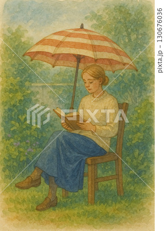 陽傘下閱讀的女子 插畫 花園靜謐時光