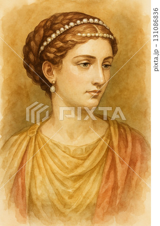 古羅馬貴婦肖像,頭髮上戴著珍珠,身穿長袍,水彩畫