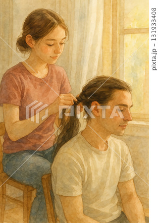 水彩民族風女子側臉插畫|羽毛髮飾 × 珠串編髮 × 風中凝視