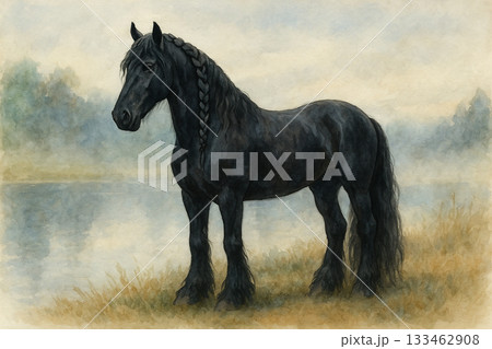黑馬與湖邊薄霧 | 攝影水彩動物畫
