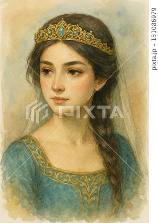 中世紀公主的水彩肖像,藍色長和服,帶有金色花朵圖案