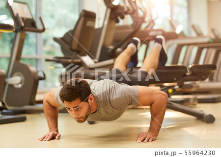 Young muscular sportsman training his muscles with sports equipment during strength training in gym