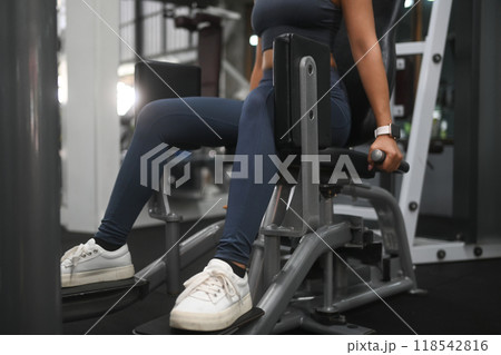 Unrecognizable athletic woman exercising her legs on abductor machine at gym
