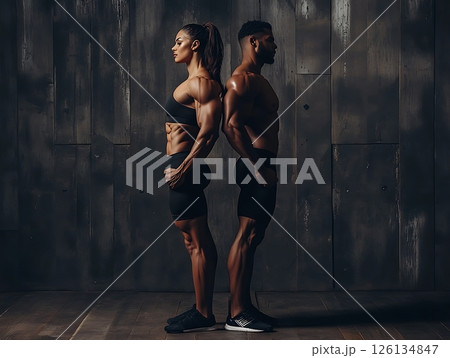 Vertical medium portrait of young adult Caucasian woman with muscular body wearing sports clothes looking at camera