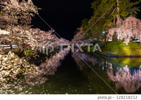 青森縣弘前市下白金町弘前公園:弘前城外護城河周圍,染井吉野櫻在燈光的映襯下,倒映在水面上